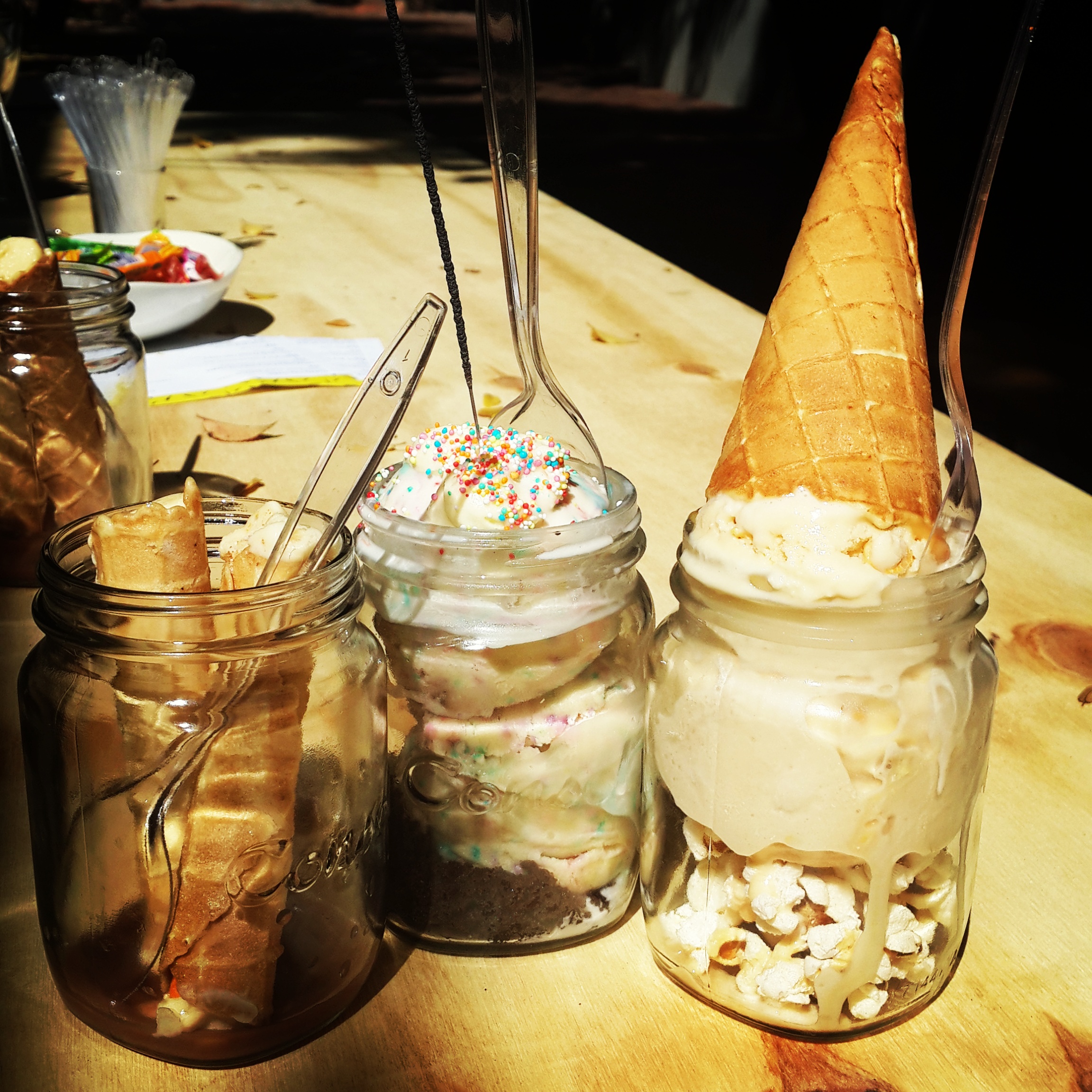 We first encountered PHIC at Ice Cream Sunday, a glorious event that takes place on the last Sunday of every month at Unit 8 in Bramley. Imagine a lazy Sunday afternoon spent outside in the sunshine, sipping on bubbles or craft beer while you sample a few different ice cream creations – it’s heaven and the only challenge is maintaining decorum rather than just going back to my roots and faceplanting into the ice cream. We now make Ice Cream Sunday a monthly ritual, and at the most recent event, they celebrated their first birthday. Consider this: a Consol jar with a piece of chocolate cake nestling in the bottom, smothered in birthday cake flavoured ice cream, topped with cream cheese ‘icing’, sprinkles, and of course, a sparkler. I’m salivating just thinking about it again! Other flavours on the day included caramel popcorn ice cream with popcorn, salted butterscotch and a wafer cone, and a pair of cannolis, one filled with malted milk ice cream and the other with Smartie ice cream. Seriously. There have been Red Velvet Sundaes, Peach and Thyme Sorbet, Stroopwafel Ice Cream Sandwiches, Tiramisu Sundaes, and even potato wedges and sun-dried tomato served with basil swirl ice cream, to name but a few. It’s decadent to say the least but hey, it’s only once a month.